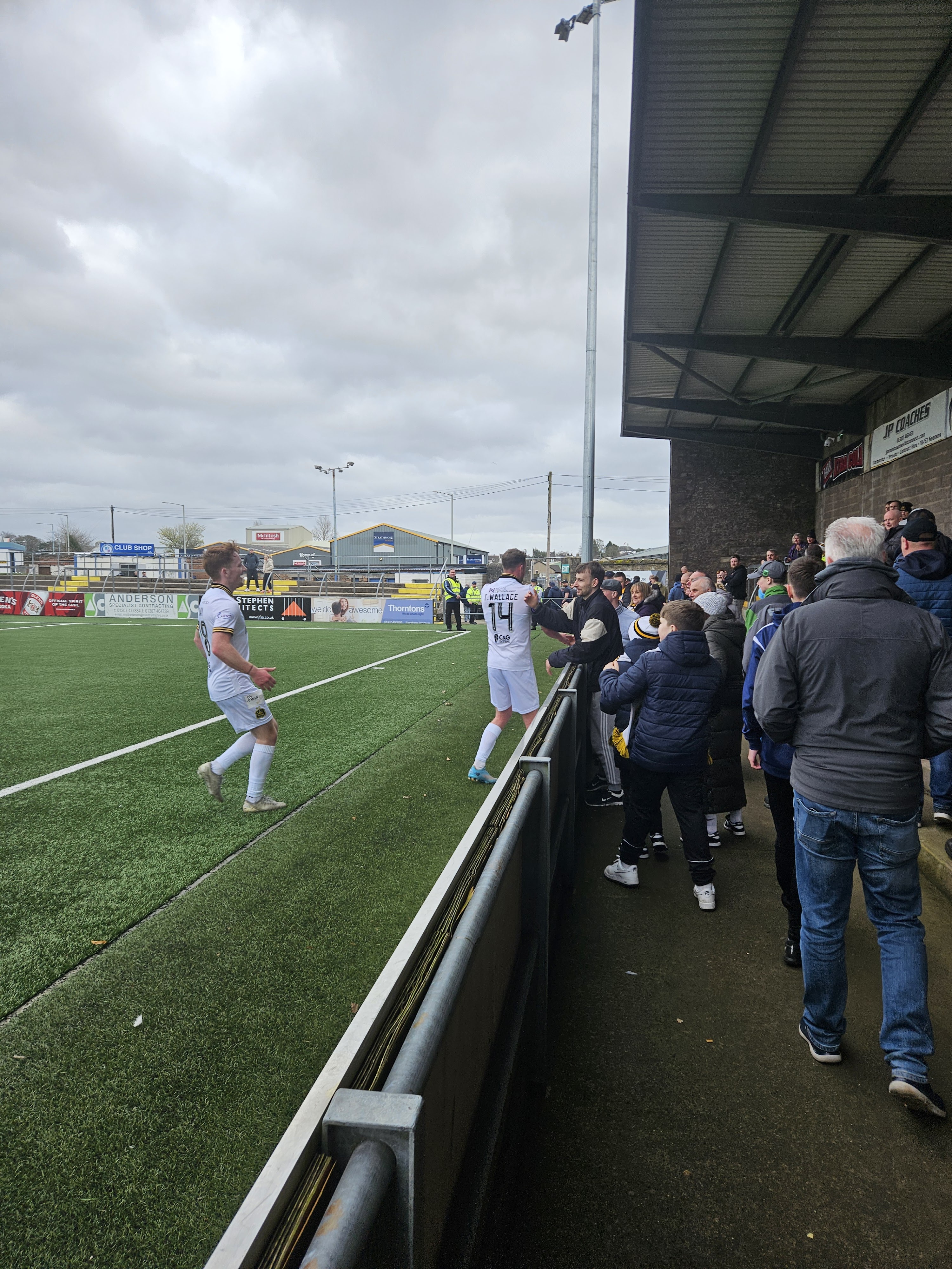 Finlay Gray and Tony Wallace celebrate with the away fans.